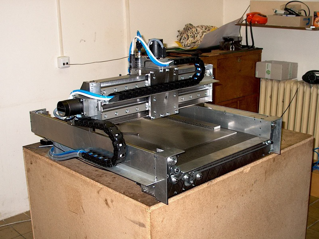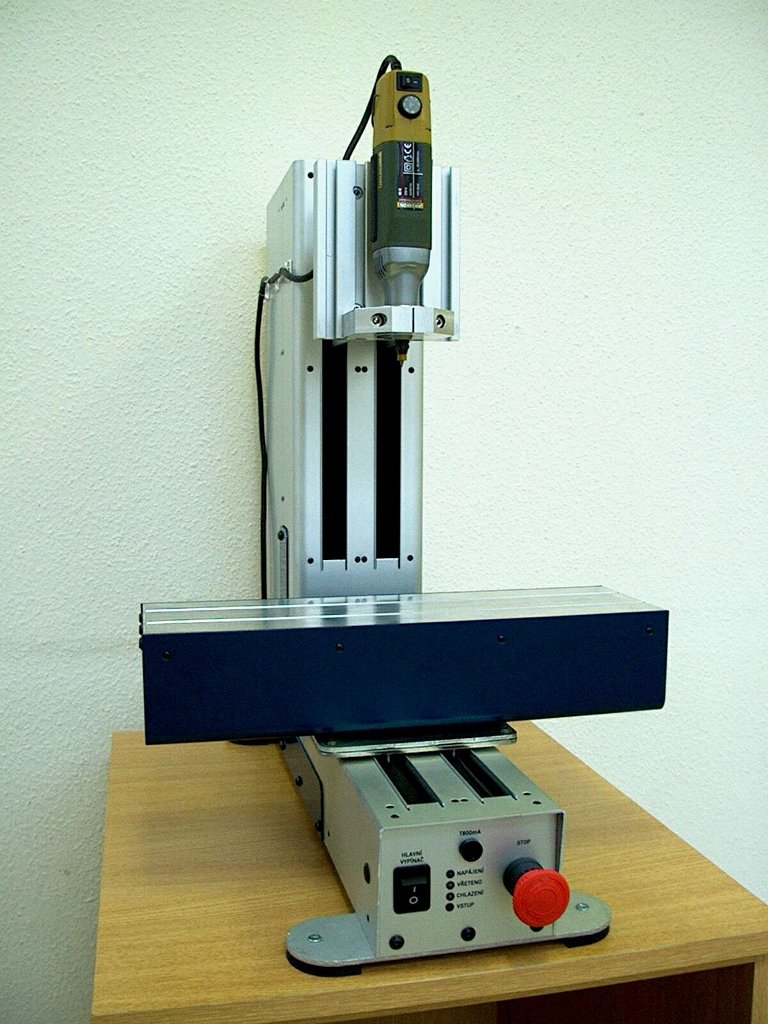 | Hotový stroj s vřetenem 50 000 ot/m | Sestavený prototyp, ještě bez eloxu. | Částečně sestavený stroj | Výroba dílů |