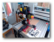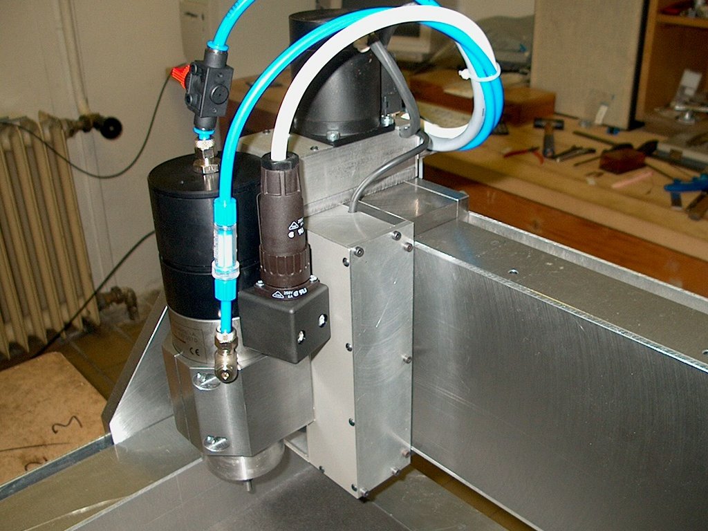| Ze stavby ještě v první provozovně firmy | Dokončený stroj s deskou vakuového upínání | Frézování laminátu | s HF vřetenem KaVo 50 000 ot/m |