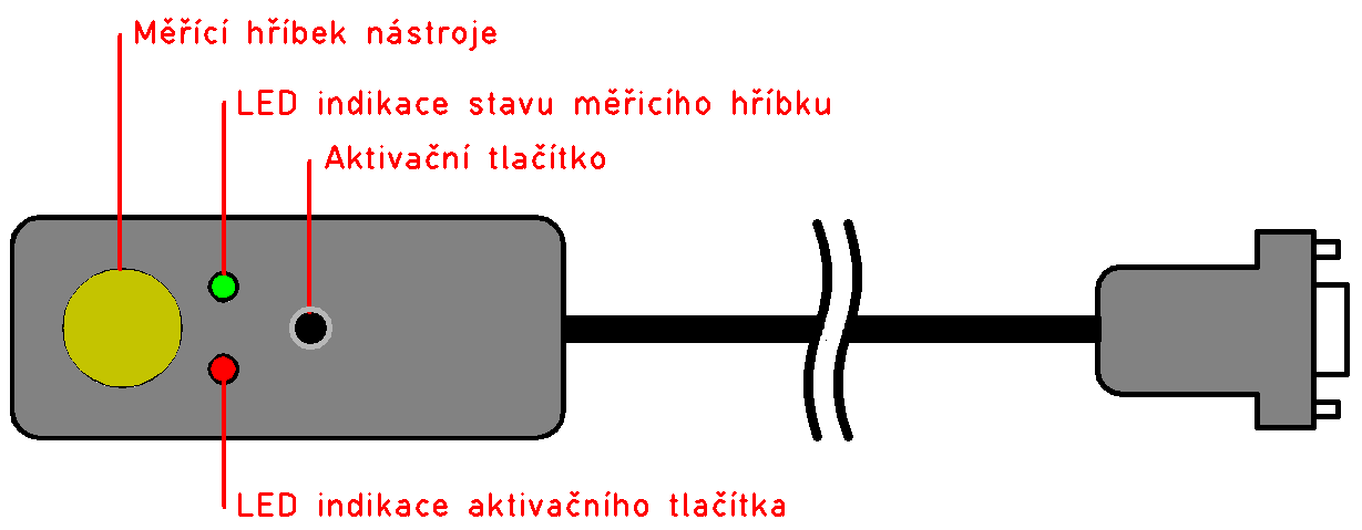 Senzor GTS3 je vybaven zelenou a červenou indikační LED, tlačítkem pro ovládání měření a měřícím hříbkem nástroje.