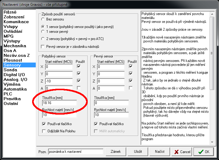Další nastavení je potřeba provést v menu Stroj/Nastavení v části Senzory.